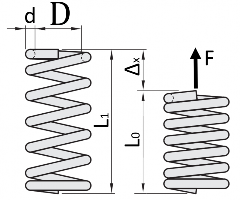 La costante elastica e la corsa della molla (allungamento o compressione) possono essere lette dalle specifiche tecniche e dai dati del produttore o sono calcolate come segue.