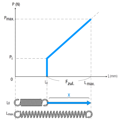 La tensione iniziale (Pi), a volte chiamata anche precarico di assemblaggio, è definita come la tensione (forza in N) necessaria per far sì che la molla mostri un cambiamento di lunghezza per deformazione.