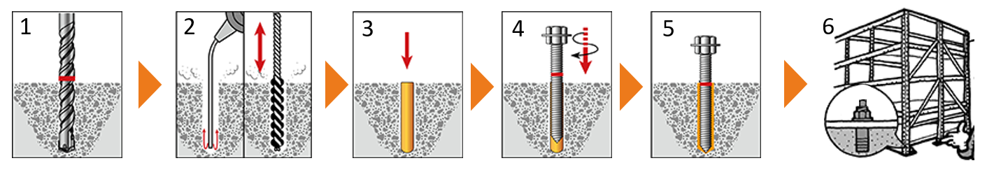 (6): Dopo la polimerizzazione, installare le rondelle e serrare i dadi - il fissaggio è ora completo.