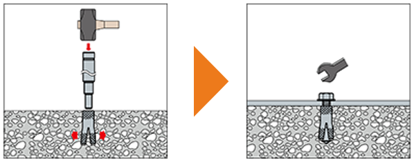 Gli ancoraggi a martello o a soffitto, invece, sono tra gli ancoraggi con un’azione di espansione controllata dal percorso. In questo tipo di azione di espansione, il cono all’interno dell’ancoraggio a martello viene spostato con un utensile di espansione per espandere di conseguenza il manicotto di espansione nel foro di perforazione.