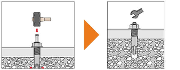 - Installazione preimpostata: L’installazione preimpostata prevede innanzitutto il posizionamento - preimpostazione - della vite prigioniera per impieghi gravosi, prima che il componente effettivo venga fissato. Il manicotto di ancoraggio deve essere completamente affondato a terra per sfruttare l’intera capacità di carico trasversale. Alcuni ancoraggi per impieghi gravosi sono dotati di speciali contrassegni di profondità per facilitarne l’installazione.
