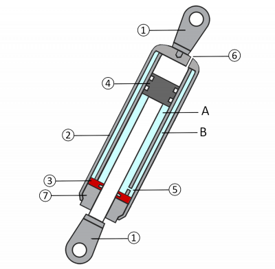 Le molle di tensione a gas sono costruite in modo simile alle molle di compressione a gas. In questi casi, tuttavia, l’asta del pistone si trova all’interno del cilindro, inizialmente in posizione scaricata. Quando l’asta del pistone viene posizionata sotto carico di trazione e il pistone viene tirato verso l’esterno, viene compresso il gas, ad es. azoto, nelle camere (A e B). Il gas compresso tenta di recuperare il volume originale e spinge il pistone nella sua posizione originale.