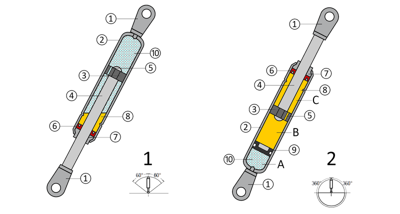 - Molle di compressione a gas con pistone flottante: Le molle di compressione a gas con pistone flottante hanno una struttura speciale con due cilindri. Il pistone flottante separa gas e olio l’uno dall’altro.